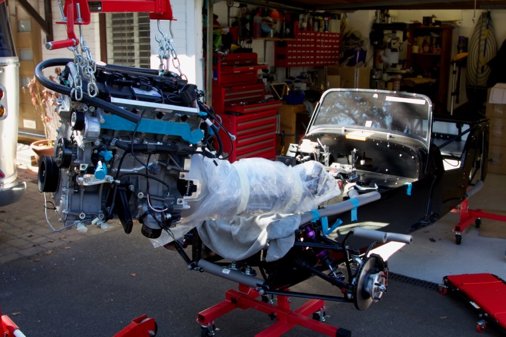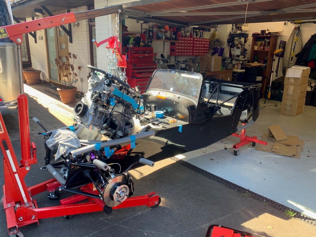 The engine installation took place without any drama. Luckily the weather was perfect so we pulled the engine crane with suspended engine & gearbox onto the drive and rolled the car forward on its mobile axle stands.