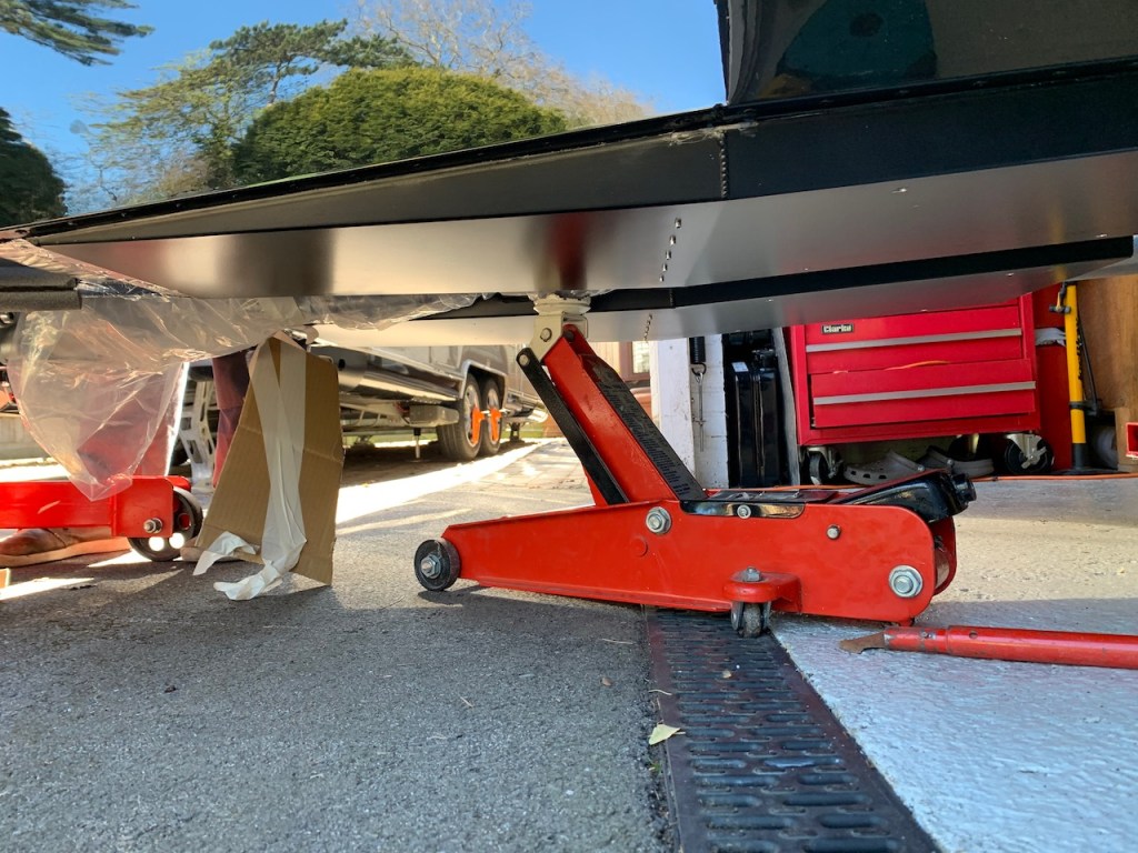 Trolley jack used to help the gearbox clear a chassis member