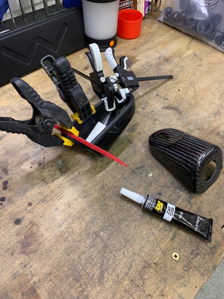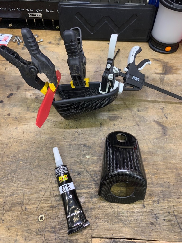 The rubber IVA trim needs to be glued in and I used a selection of clamps to hold it in place around the tight radiuses.