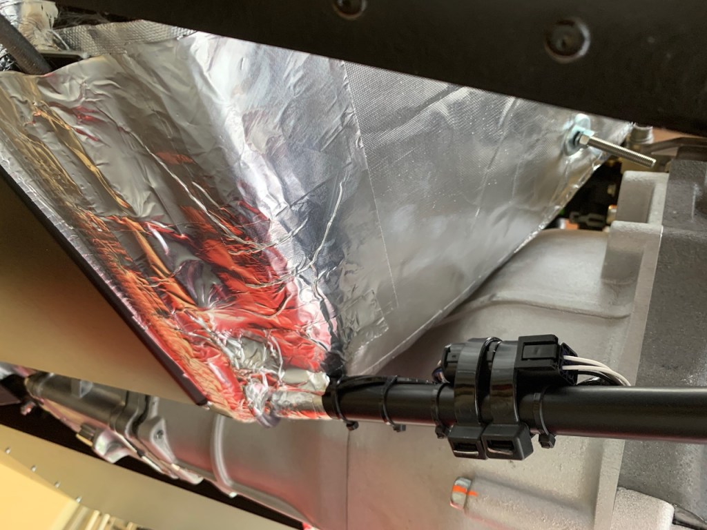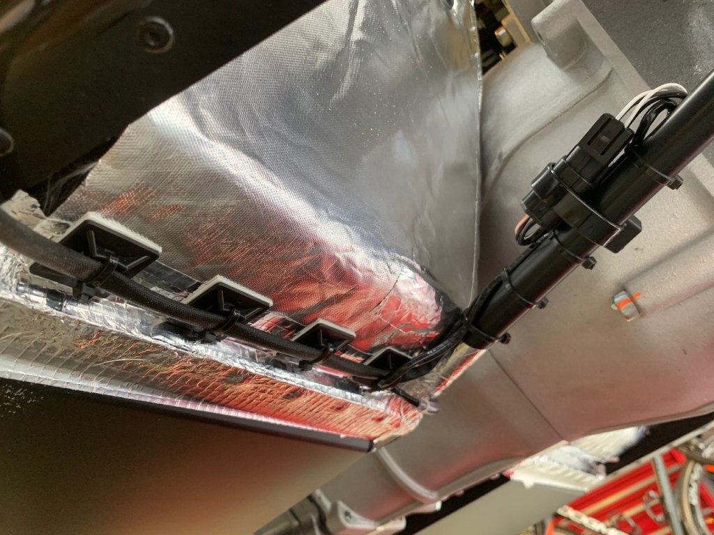 The lambda sensor needs to be connected to the wiring loom and the wiring secured to the chassis. I stuck cable tie blocks with 3M self adhesive pads to the heat shield along the chassis rail and then tidied everything up with more cable ties before covering it all with aluminium tape. I even used a small section of washer pipe to protect the loom cable as it passed around the bottom edge of the footwell. There is a lot of surplus cable to get rid of so I doubled this back on itself and secured it with the Econoseal connector to the chassis rail with cable ties.