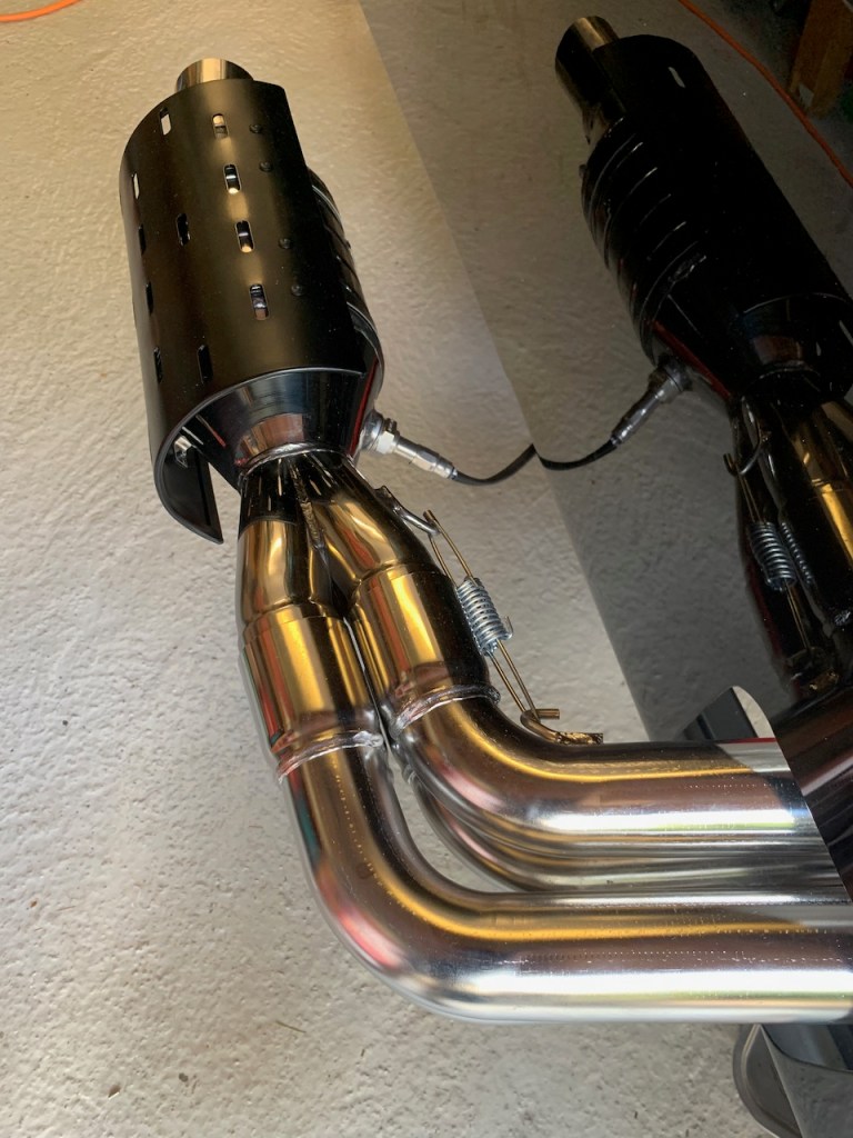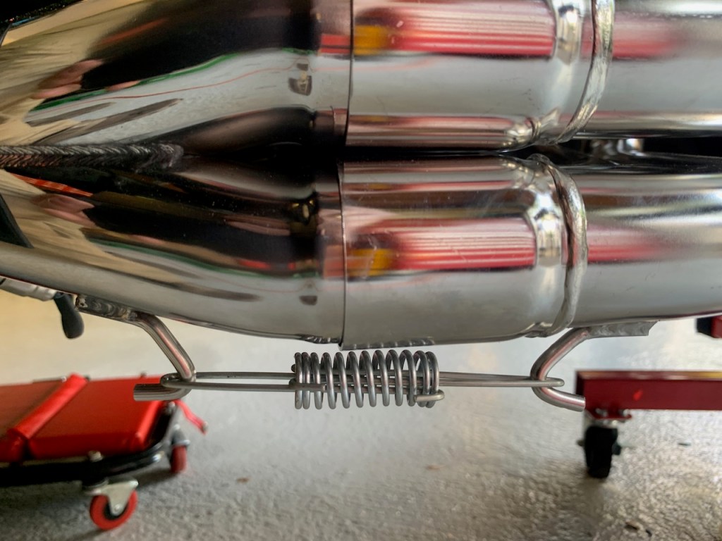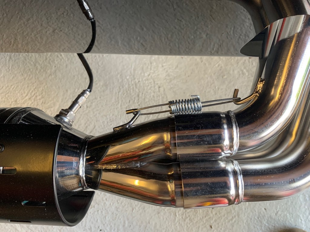 The collector is held on by two compression spring and hook assemblies that act as a tension fitting to pull the two parts of the exhaust system together.