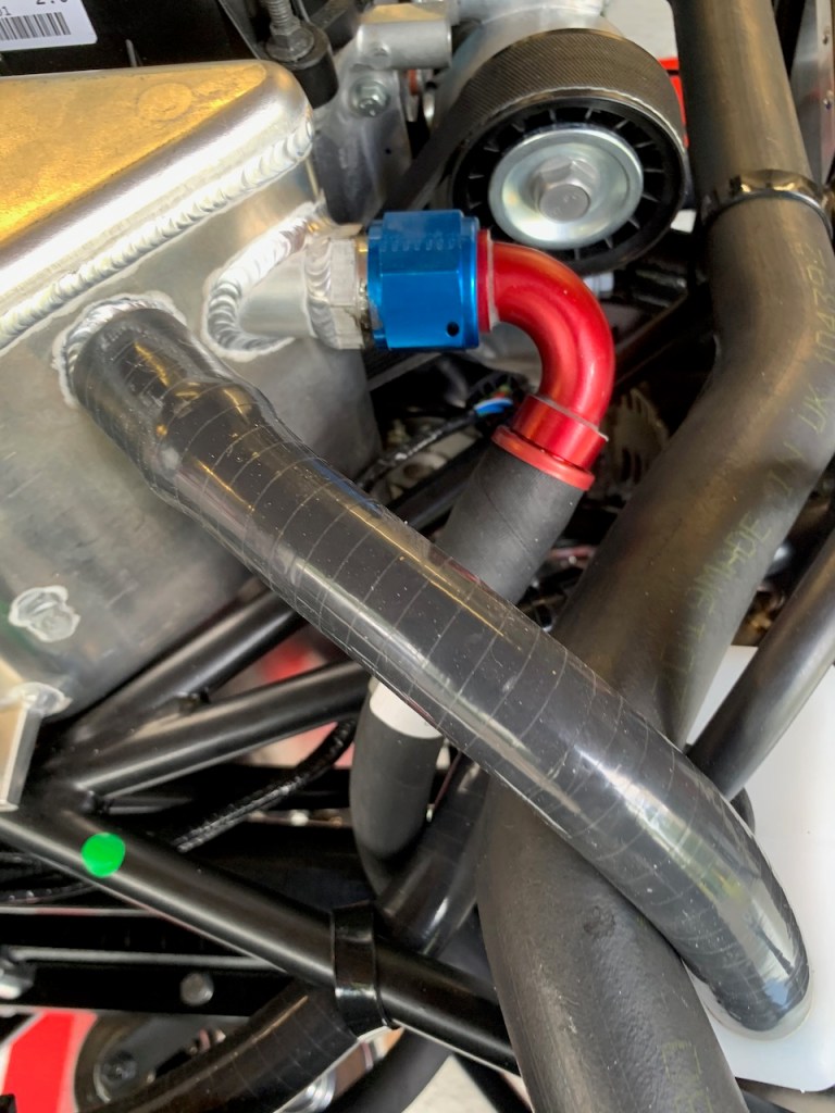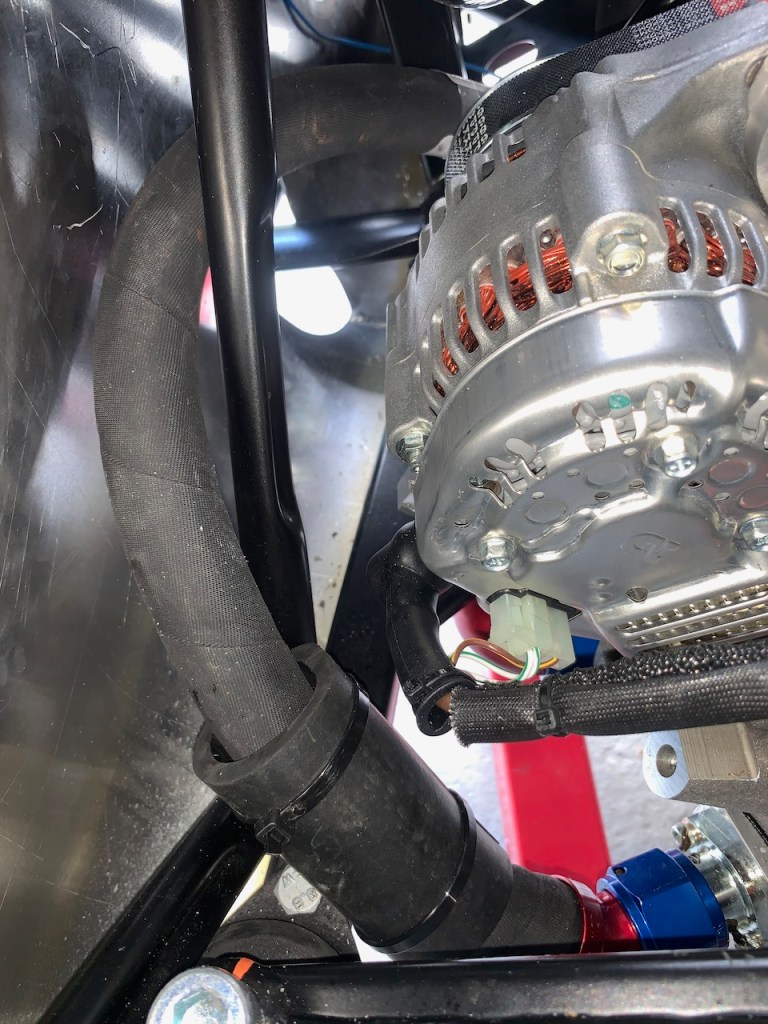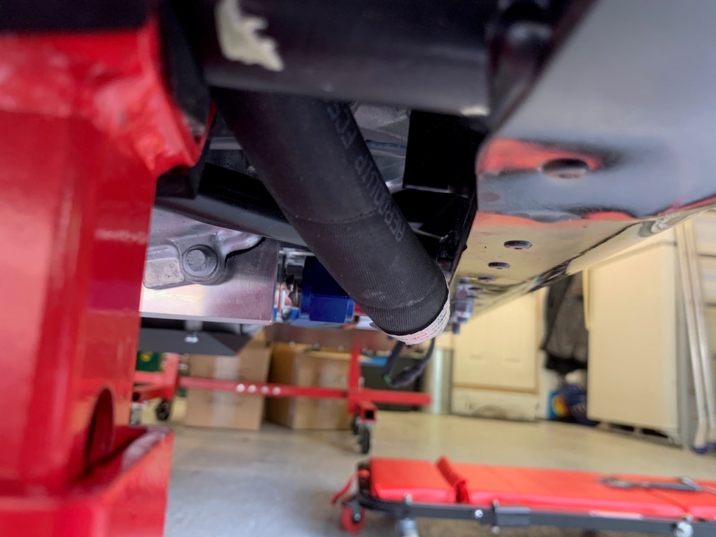 - The pipe exiting the rear of the oil cooler plate goes up inside the engine bay between a diagonal chassis member and the side skin. Whilst this is clear of the alternator pulley / belt it does run close to the chassis. To avoid the risk of chaffing I’ve used a piece of split / cable tied radiator hose as a conduit over the bottom chassis rail and will use some thinner tubing (or possibly a section of bicycle tyre and cable ties) to protect the hose where it rests against the diagonal chassis member.